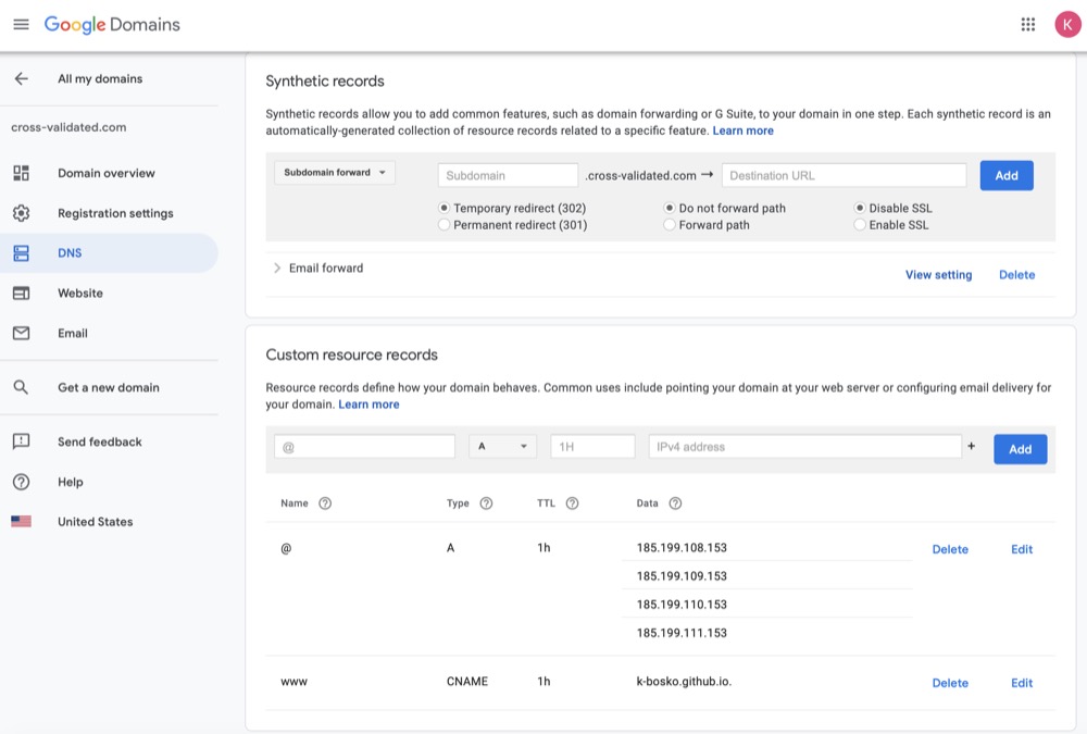 Now we need to configure DNS records at Google Domains that should point to GitHub’s servers3: